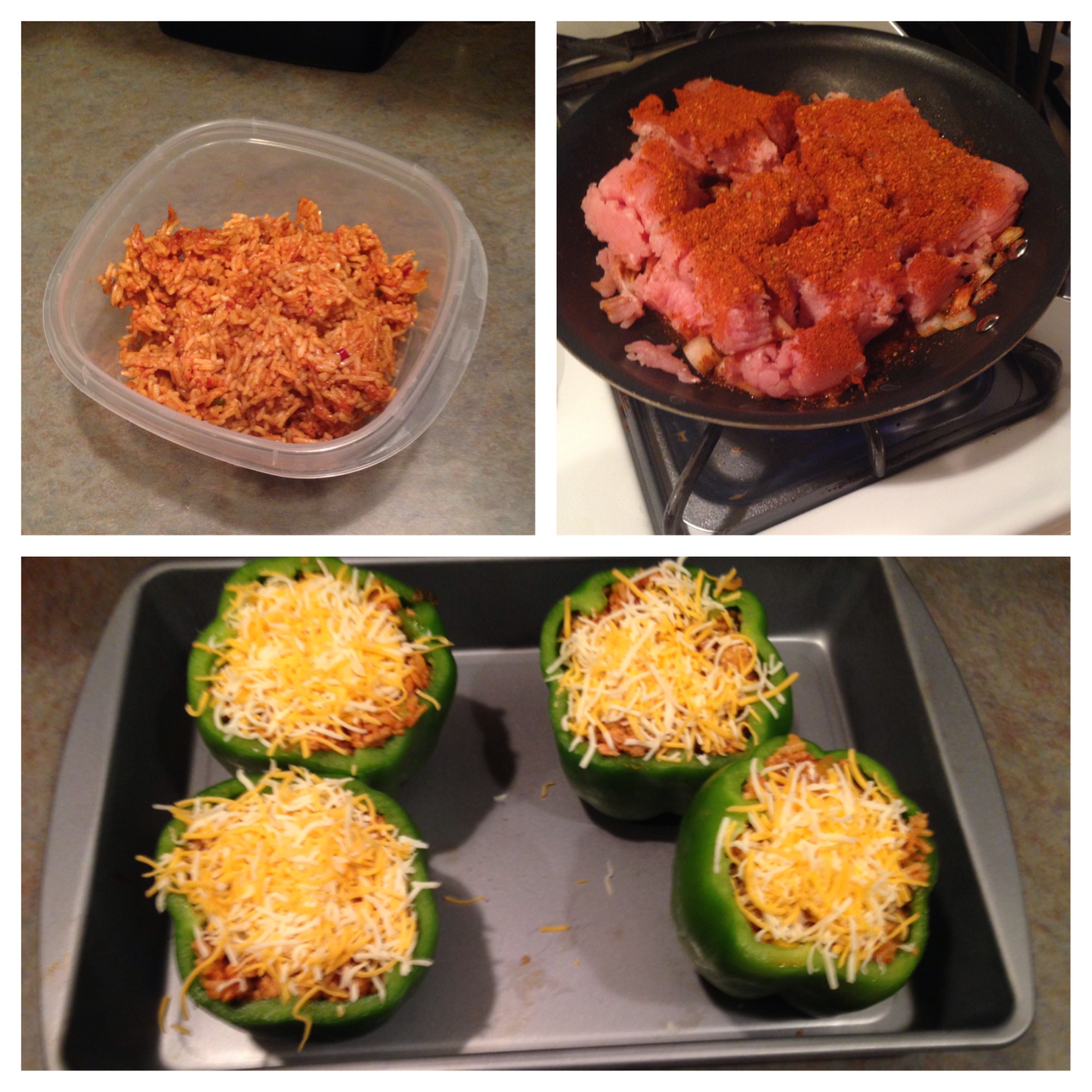 Brown the meat with a little vegetable oil, taco seasoning, the onions, & the garlic in a nonstick pan over medium heat. My secret tip is that when the meat is done, stir in the ketchup and sriracha. It adds a good tomato-ey flavor and keeps the meat moist. Plus the sriracha adds a yummy spice/kick. Once the meat is cooked, crumbled and cooled, mix it with the corn (or beans) & rice. Note that while the meat is cooking, prepare the peppers by slicing off the tops and cutting out the ribs & seeds. Rinse and dry before stuffing. Lastly, stuff the pepper and top with the shredded cheese. Bake at 350 degrees for 20 min or until the cheese has melted & pepper has charred. Serves 4 people, 1 pepper per person.