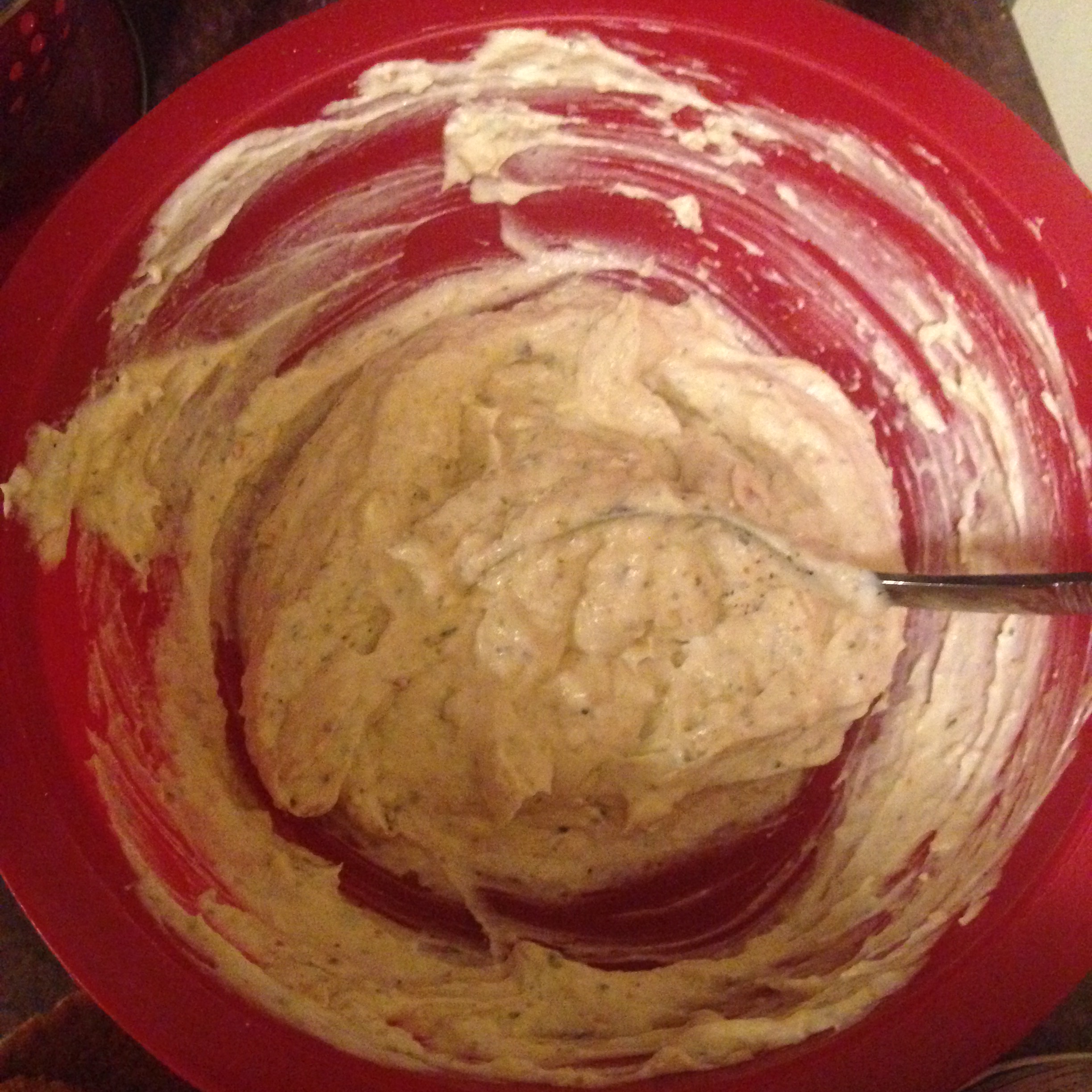 Spoon each chicken breast with the mixture. Make a foil tent for each breast. Bake at 375 degrees for 45 min. For the last 5 minutes take out of foil, baste with juices and broil on low. (I did it on high and started charring the tops of the chicken-not a good look)