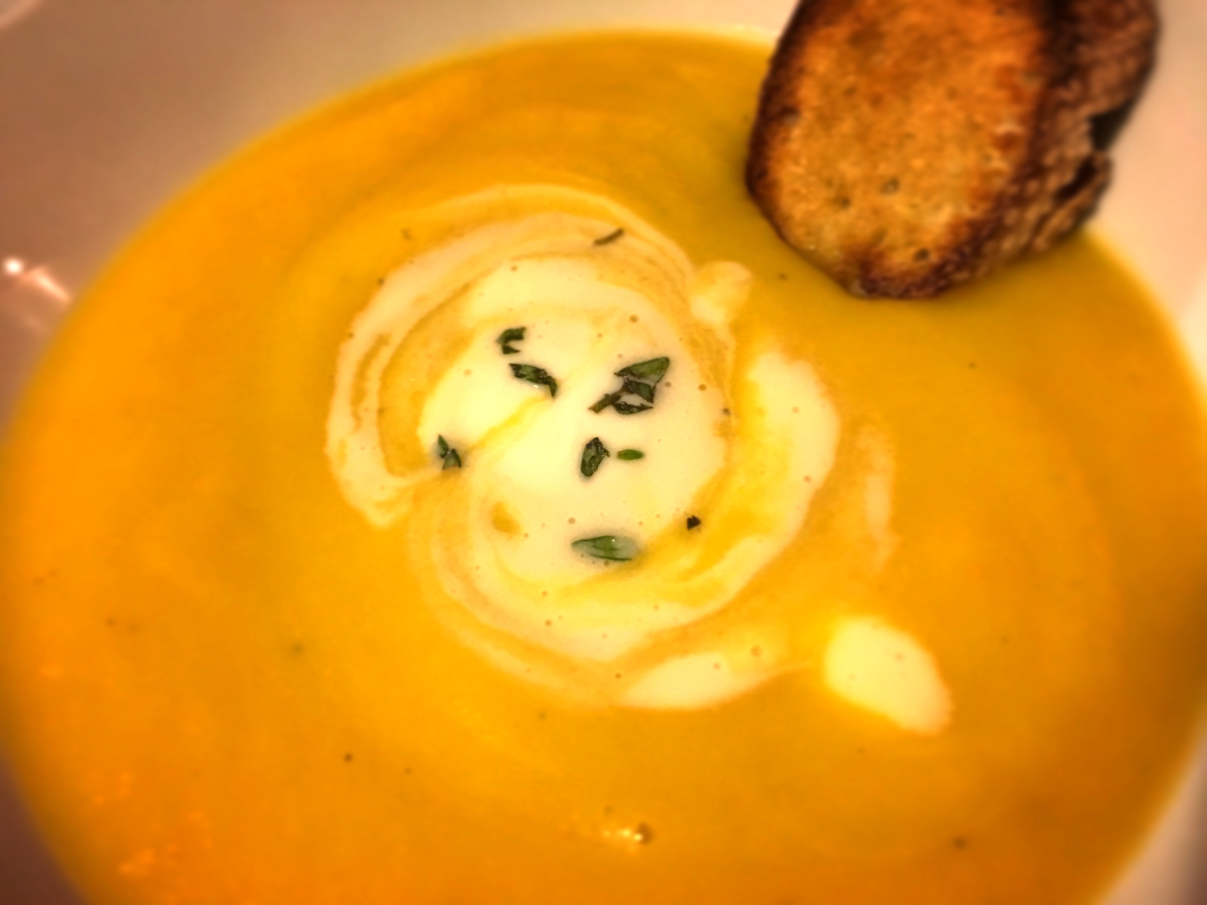 In a large soup pan, heat the olive oil over medium heat. Toss in the carrots, celery, and onion and cook for roughly 5 minutes, or until the onions are translucent. Add the chicken broth, 1/2 tsp of the thyme, butternut squash, salt and pepper. Let all of the ingredients simmer for 30 minutes, or until the squash is tender enough to fall apart. After the 30 minutes, I used an immersion blender but you can also just stir the crap out of it until all of the ingredients are blended and no longer whole. You’ll notice it’s still slightly grainy at this point. In small batches, pour the soup into a blender to get the final chunks out and really smooth it out.