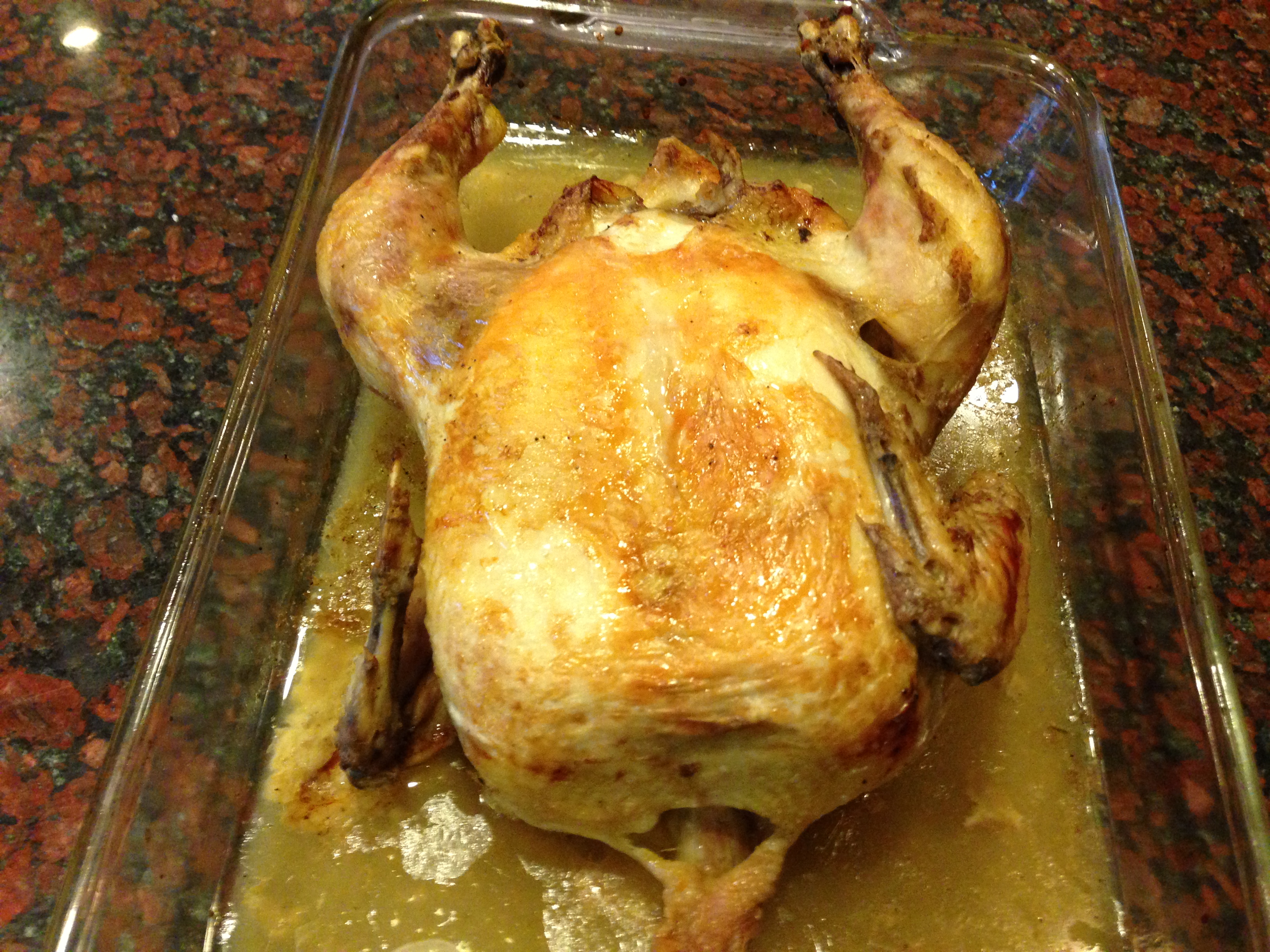 This is the easiest way to make slow roasted chicken. Turn the oven on to 400 degrees. Choose a baking pan that you also want to serve in. In the pan add olive oil, lemon juice, salt and pepper. It doesn’t matter how much, you want to be sure you fill to cover the bottom of the pan and be able to roll the chicken in it. Some Greeks like lots of lemons, 5-6, I personally use bottled lemon juice and put in about 1/3 cup, but don’t bother measuring. Just pour in the lemon and olive oil. Roll the chicken around in the liquid and bake the chicken breast side down. This method will insure that the white meat will stay moist.