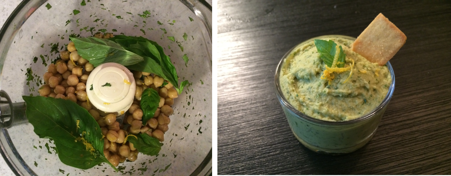 I had friends coming over and literally had no finger food ready, so I went pantry-diving. Chic peas? Check. Basil about to go bad? Check. So many lemons I couldn’t possibly use them all myself? Check. All of my friends like hummus, so why not give it a whirl? Like literally, whirl it in a food processor. (I crack myself up…)