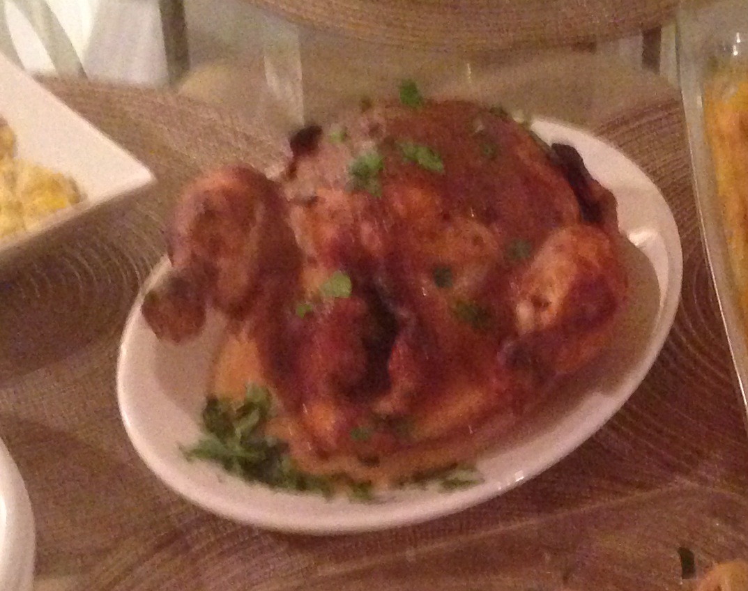 Preheat oven to 350°F. In a small mixing bowl, combine 1/2 cup of the fig butter, 1/2 cup of the mustard and 1 cup of the vinaigrette. Rinse and thoroughly pat dry the chicken (moisture on the chicken will prevent the glaze from sticking to it). Place the chicken in a baking dish and spread 2/3 of the glaze mixture generously all over the chicken. (I did so, too generously. What I mean is that there was so much of the glaze that was on the pan surrounding the chicken that it started to burn & made my fire alarm go off. Crisis was averted by opening a window and switching to a clean pan, but it messed up the heating/cooking temp of the chicken & probably could’ve gotten an extra 20 min the oven to make up for the mid cooking swap). They say the rule of thumb is 20 min per lb. (I didn’t put much thought into that and just pulled it out when it looked done). Anyway half way through I basted the chicken with the remaining 1/3 of the glaze mixture, so moist & divine this chicken came out!