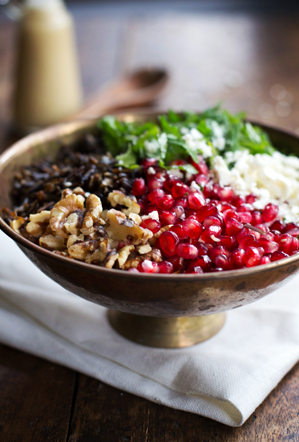 One recipe we just had to share with you is her Pom Kale Nut Salad. I mean, kale makes you think of a health freak, but this salad is yummy, promise. It has all the palate pleasers we rave about: sweet, tart, salty, crunchy, creamy, etc…Plus its filling enough to have as a meal and it truly is a sultry salad. Just look how tantalizing! Pomegranates really are the jeweled produce of Winter.